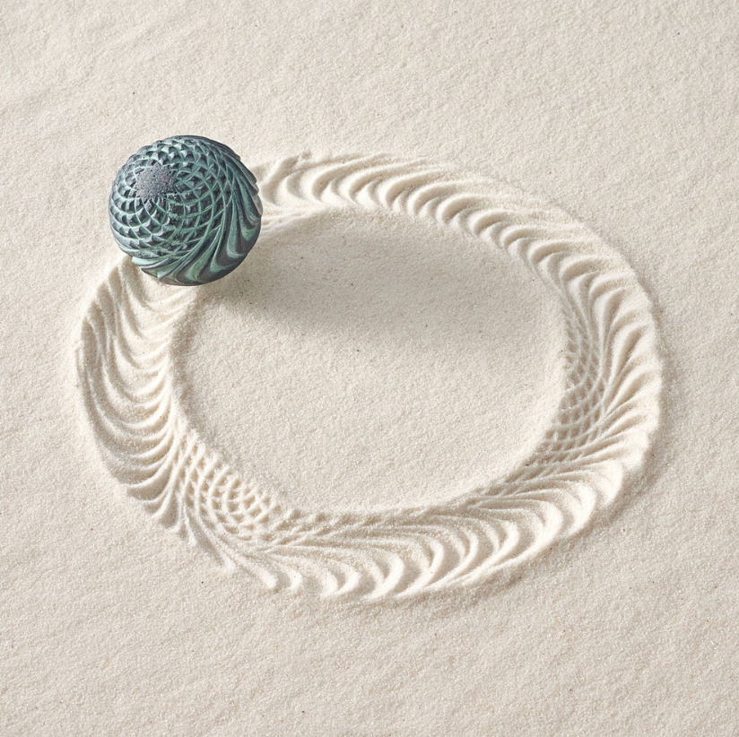 Three distinct textures, one cohesive surface, continuous beauty. This twisty design explores a stacking palm growth pattern around its equator; wrapping to its poles like unfurling petals and floral seed patterns.
